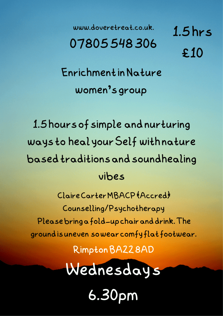 Enrichment in Nature – Wednesday evenings 6.30pm at Dove Retreat. Please book a place 07805548306 and pay on the day of booking. If cancelling, then a change of attendance date is available but unfortunately no refunds. Please contact me for more information clairecartertherapy@gmail.com